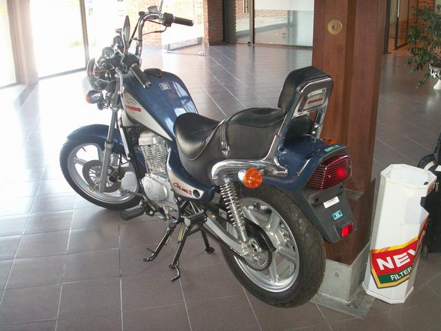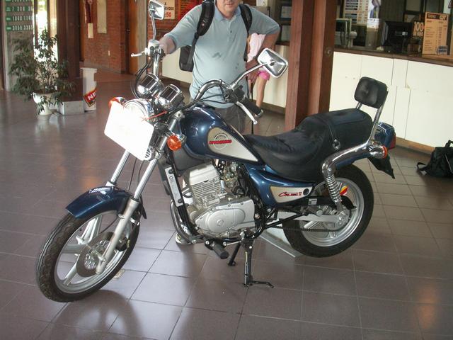 This motorcycle, made by Suzuki is on display in the terminal. We will
