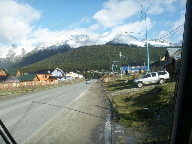 The reflection from the tour bus window masks a bit, but the tin roof and the arched windows are discernable. The wood is from local forests.